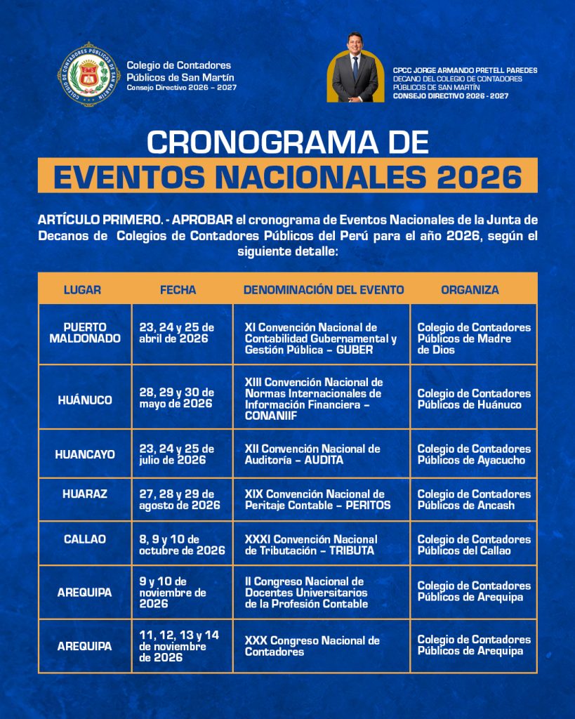Ya se encuentra disponible el Cronograma de Eventos Nacionales 2026, un espacio diseñado para fortalecer, actualizar y potenciar el desarrollo de su ejercicio profesional contable.
