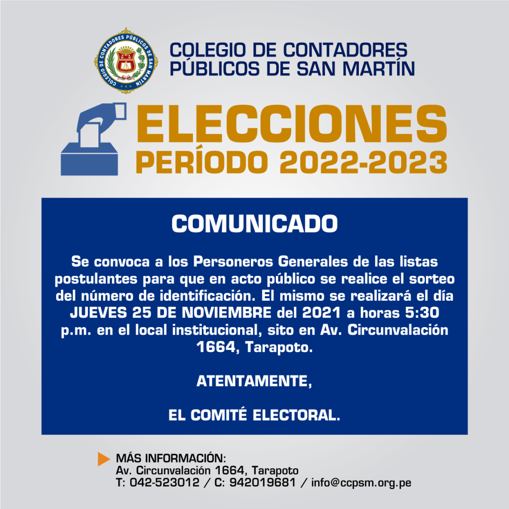 Se convoca a los Personeros Generales de las listaspostulantes para que en acto público se realice el sorteo del número de identificación. El mismo se realizará el día JUEVES 25 DE NOVIEMBRE del 2021 a horas 5:30 p.m. en el local institucional, sito en Av. Circunvalación 1664, Tarapoto.